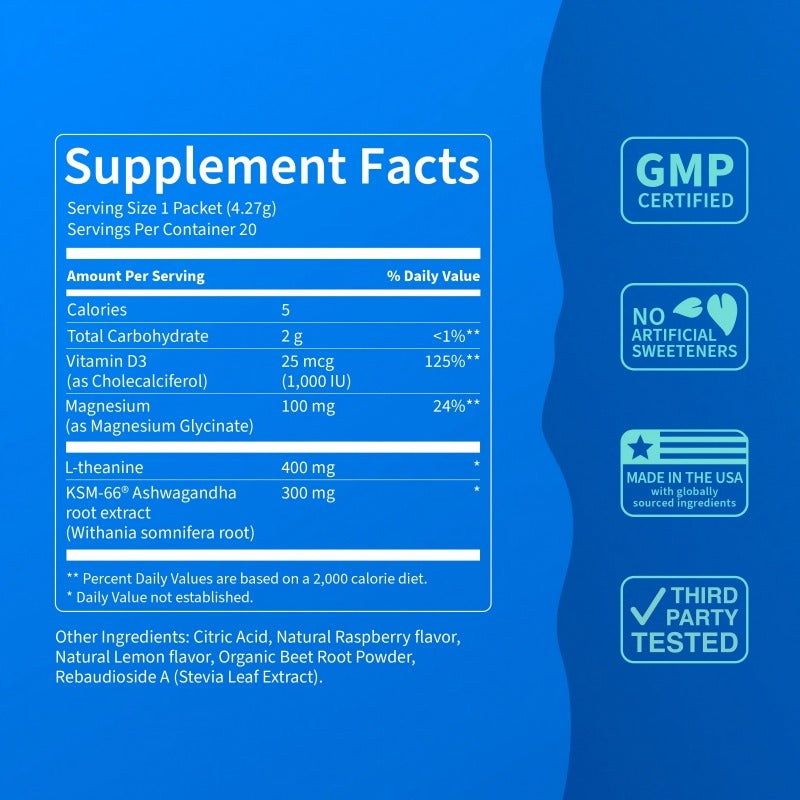 Activa los receptores GABA, lo que produce un efecto calmante en el cerebro. Favorece la calidad del sueño, el estado de ánimo y la concentración. Supercalm contiene 100 mg por ración.