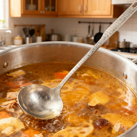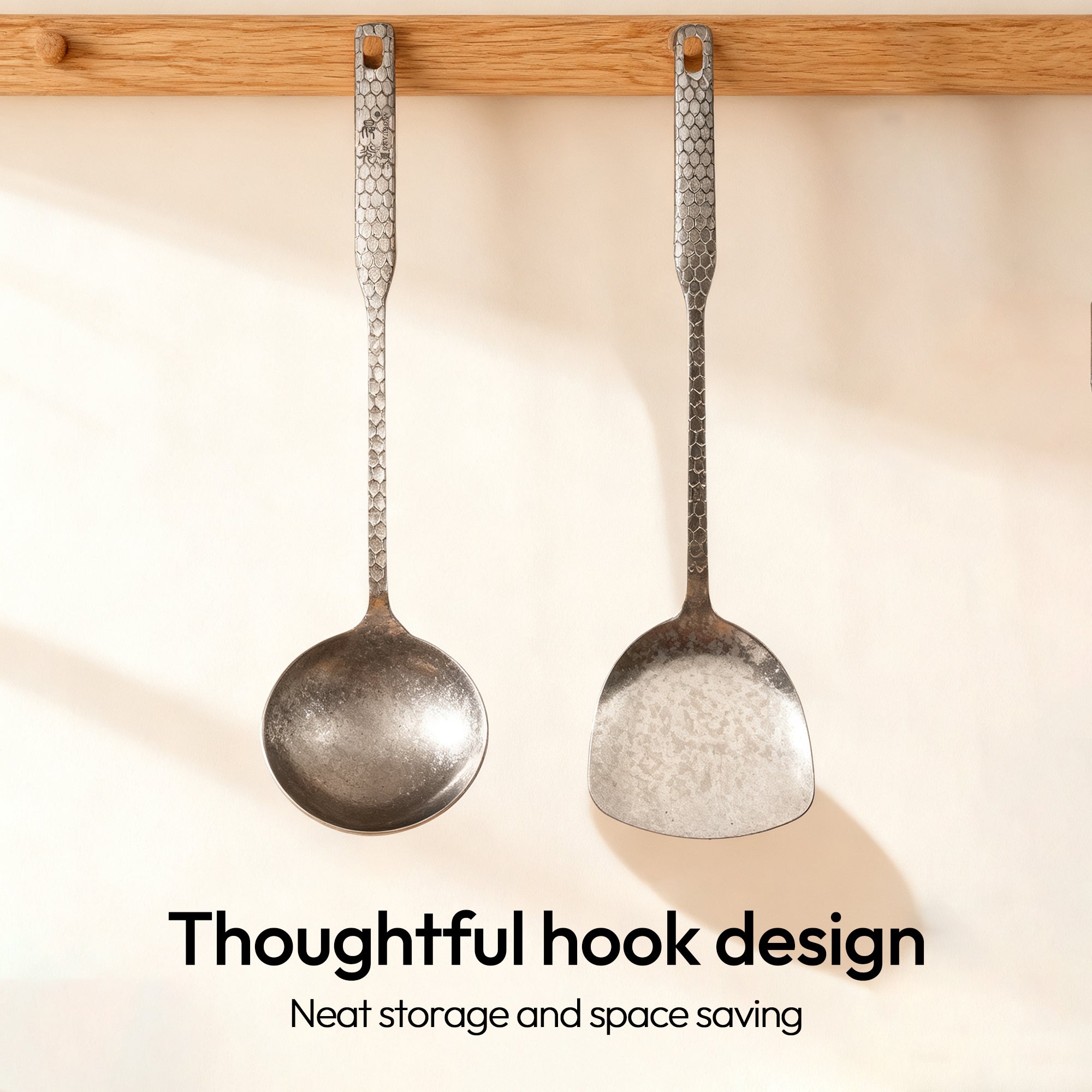 Diseño ergonómico para mayor comodidad y seguridad: Los bordes redondeados y lisos garantizan la ausencia de rebabas, lo que lo hace seguro y cuidadoso con sus utensilios de cocina. El diseño de mango largo permite un uso cómodo durante largos periodos sin fatiga. Además, el mango con aislamiento térmico al vacío le garantiza que no tendrá que preocuparse por el calor, mientras que el diseño de gancho integrado le permite colgarlo cómodamente para ahorrar espacio.
