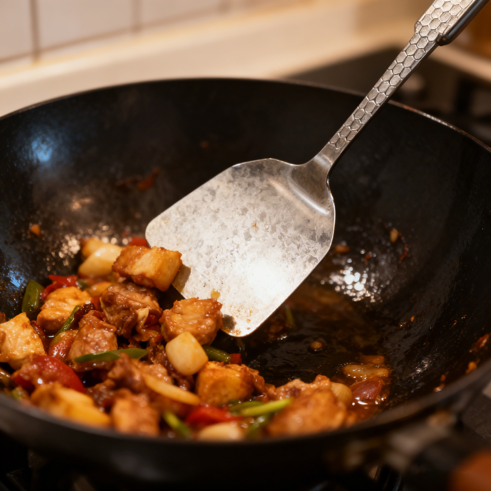 Ultraligera pero extremadamente resistente: El titanio es más ligero que el acero, pero más resistente que el aluminio, lo que hace que esta pala para saltear sea fácil de manejar, incluso durante largas sesiones de cocina. Es cómoda de sostener y perfecta para quienes disfrutan grabando su proceso de cocción.